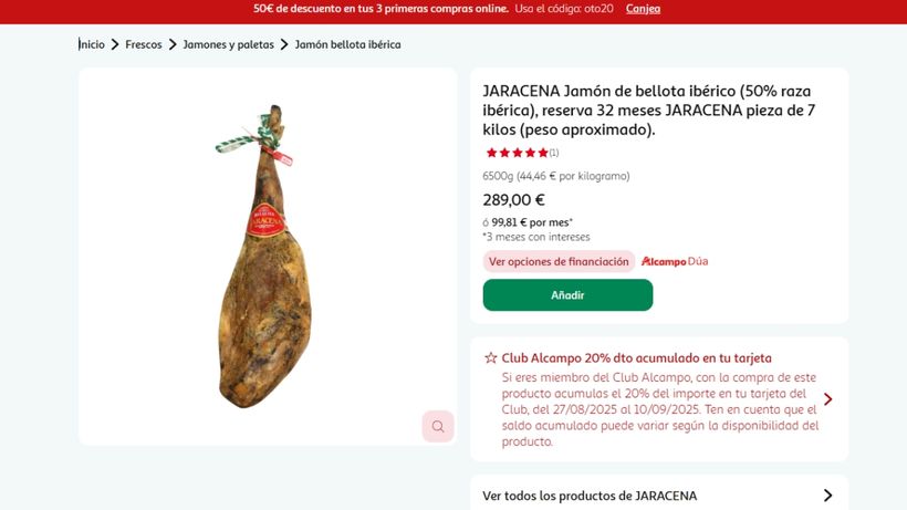 Esta relación calidad precio sorprende ya que se trata de un producto que, por su elaboración, podría ser considerado como gourmet, ideal para disfrutar de una buena mesa acompañado de aceite de oliva virgen extra. Más aún cuando, en caso de tener la Tarjeta del Club Alcampo, se podrá sumar un descuento del 20% y, si la compra del jamón es una de las 3 primeras compras online, se descontarán 50 euros más.