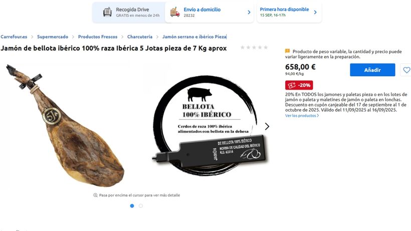 Carrefour tiene activa una promoción especial del 20% de descuento en todos los jamones y paletas pieza o lotes de jamón y paleta en maletines de jamón o loncheados. Este cupón es canjeable desde el día 17 de septiembre hasta el 1 de octubre de 2025.