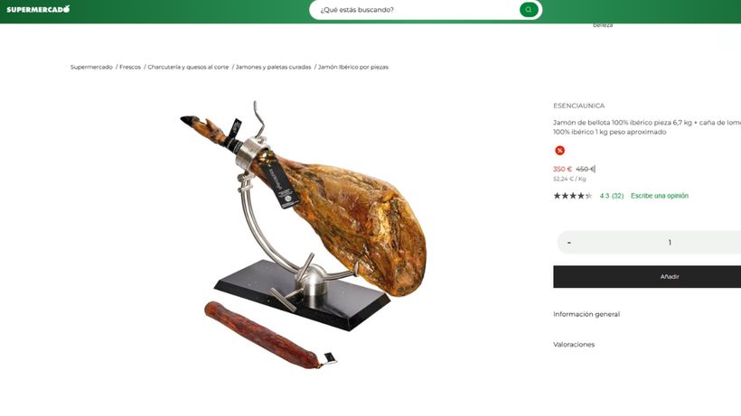 Y por si esto fuera poco, los supermercados de El Corte Inglés regalan con la compra de esta pieza de jamón serrano, una caña de lomo de bellota 100% ibérico de 1 kilo de peso. Un pack que ya cuenta con las primeras opiniones por parte de los compradores que cifran en un 4,3 sobre 5 su satisfacción con el producto.
