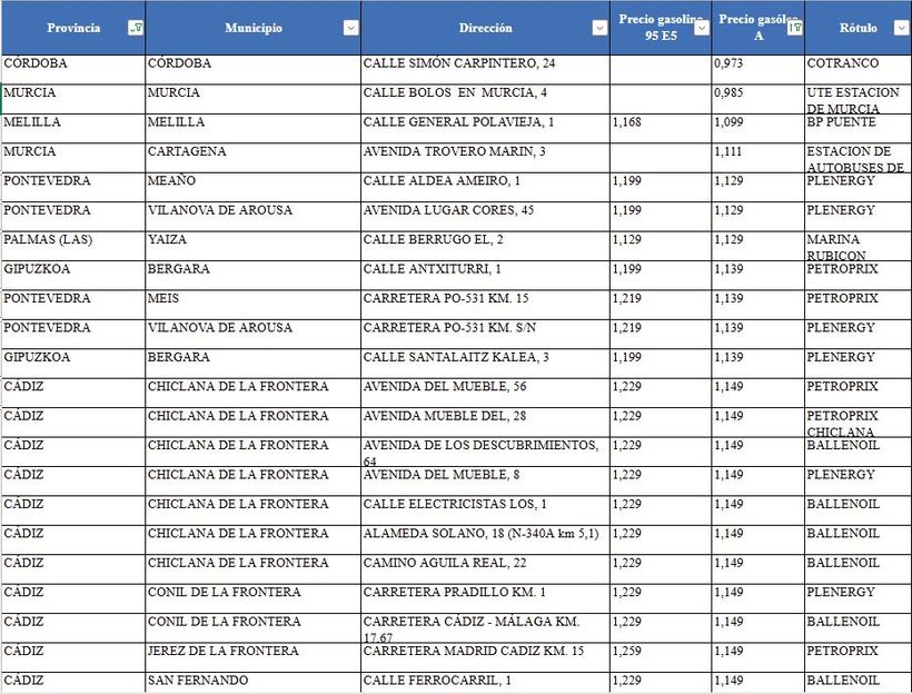 El precio más barato del diésel esta semana vuelve a estar en la gasolinera Cotranco (0,973 euros), situada en la calle Simón Carpintero número 24, en la provincia de Córdoba. La siguiente opción para repostar que tiene un coste menor es la UTE Estación de Murcia, con un precio de 0,985, que se encuentra en Calle Bolos número 4, en Murcia capital.
