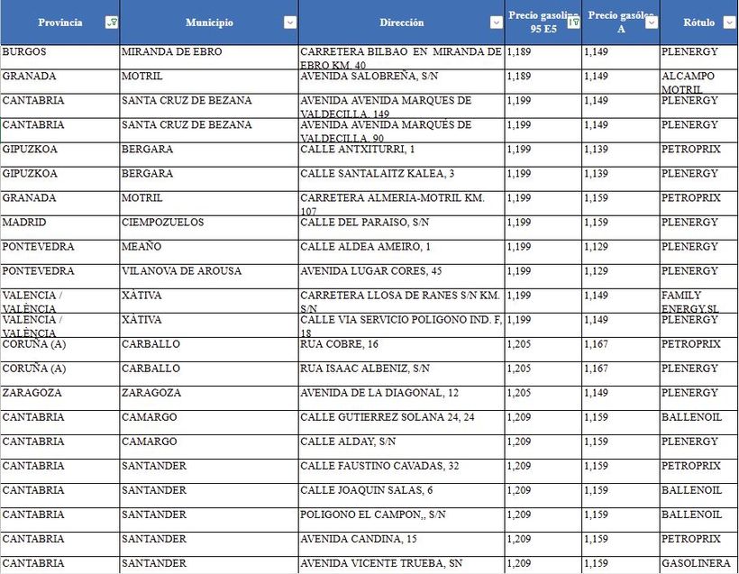 En el caso de la gasolina, que ha caído un 0,21% esta semana, se puede encontrar la estación más barata en Plenergy, con un precio de 1,189 euros, la cual se encuentra en Carretera Bilbao en Miranda de Ebro Km. 40 (Burgos). En el siguiente lugar y con el mismo precio (1,189) está la gasolinera Alcampo Motril, ubicada en la Avenida Salobreña, S/N, en Motril (Granada).