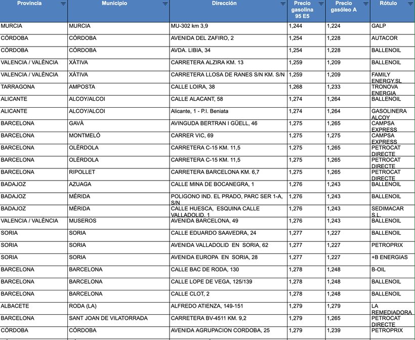 Para rellenar el depósito con gasolina al precio más bajo habrá que ir hasta Murcia, a la Galp situada en la MU-302, km 3,9 donde el litro cuesta 1,224 euros. Luego, en Córdoba, en la avenida del Zafiro número 2 donde la gasolina 95 se vende a 1.254 euros (Autacor) y también en Córdoba por el mismo precio se podrá repostar por 1,245 euros el litro en Ballenoil (avenida del Zafiro, número 2).