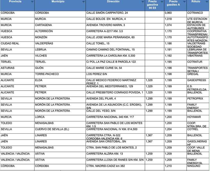 El precio más barato del diésel (gasóleo A) se encuentra esta semana en la gasolinera Cotranco, situada en la calle Simón Carpintero número 24 de Córdoba donde se paga a 0,960 euros el litro. Después, en Murcia (calle Bolos, 4) está la UTE Estación de Murcia donde cuesta 1,018 y en tercer lugar la Estación de Autobuses de Cartagena, en la que repostar diésel cuesta 1,074 euros el litro.