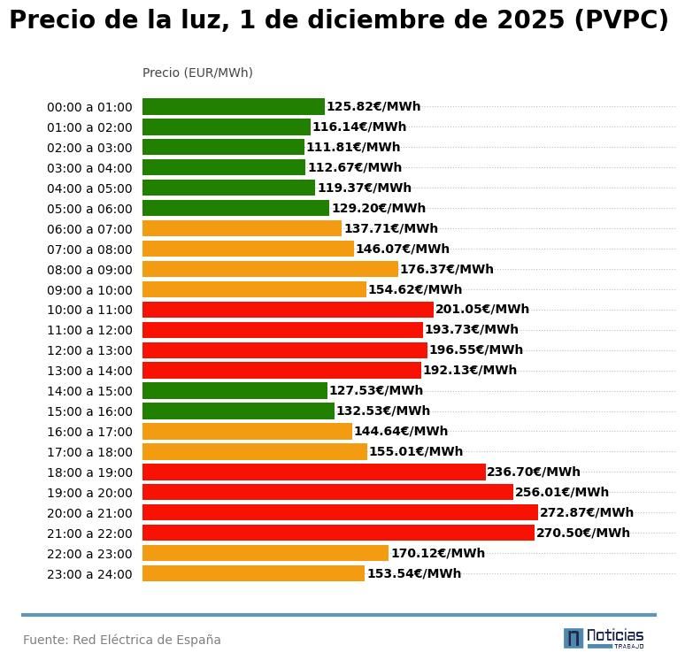 Precio de la luz por horas, lunes 1 de diciembre (PVPC)