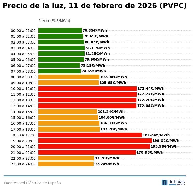 Precio de la luz por horas, miércoles 11 de febrero (PVPC)
