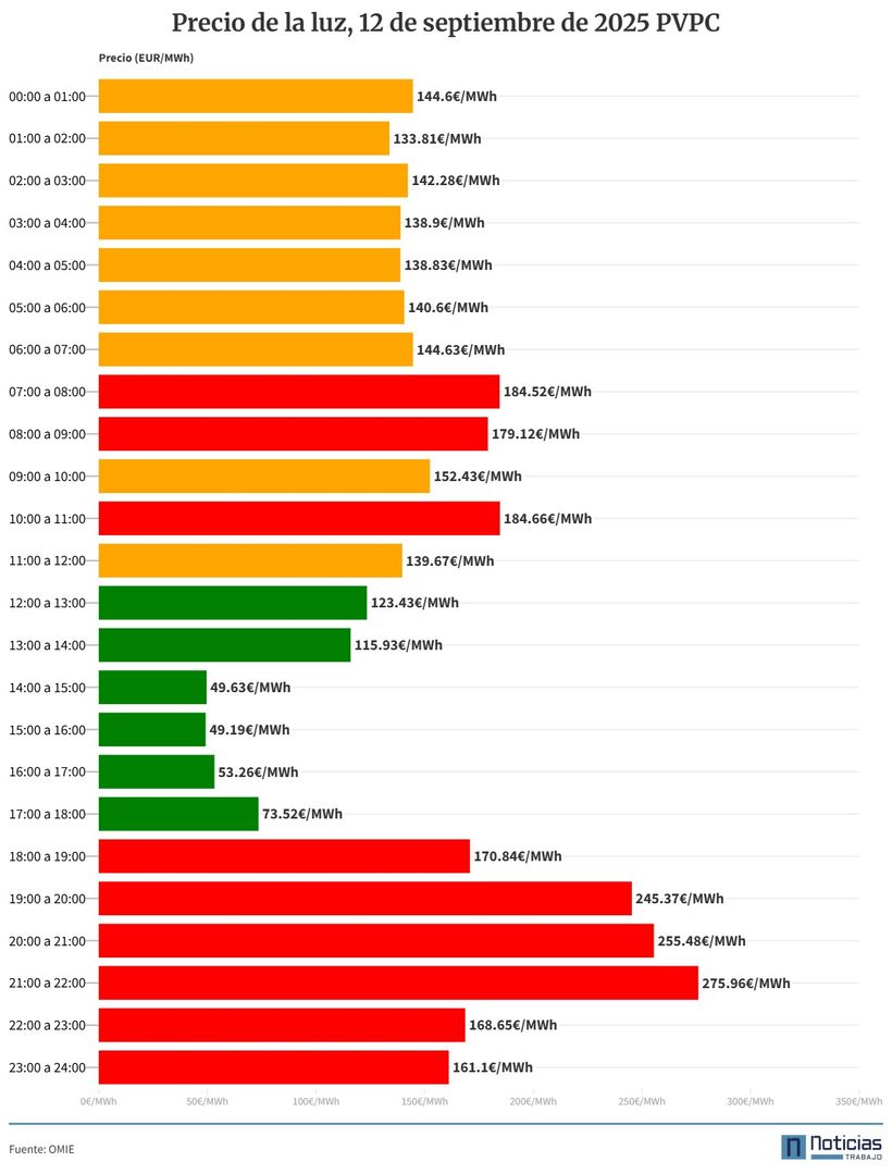 ¿A qué hora es más barata la luz hoy 12 de septiembre de 2025?