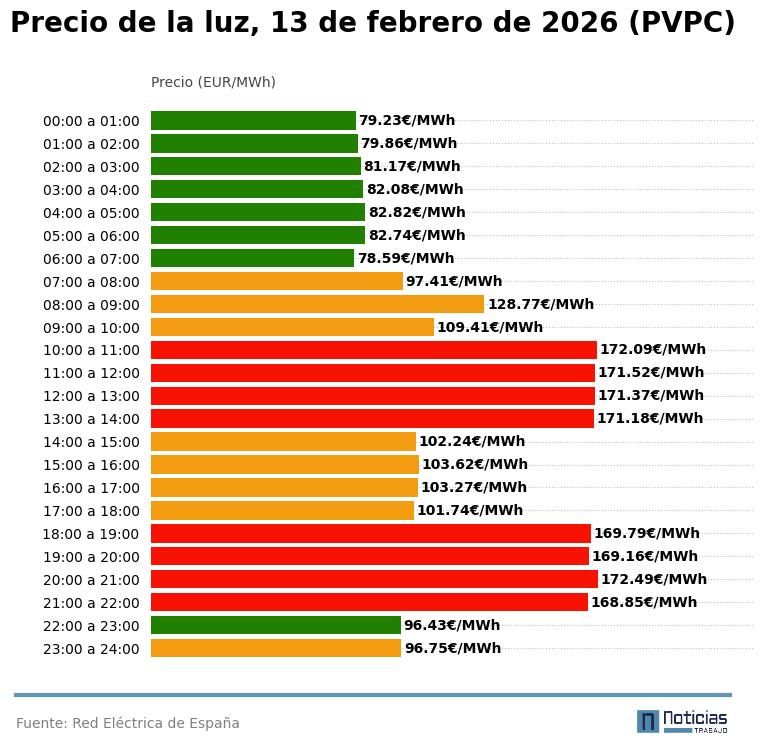 Precio de la luz por horas, viernes 13 de febrero (PVPC)