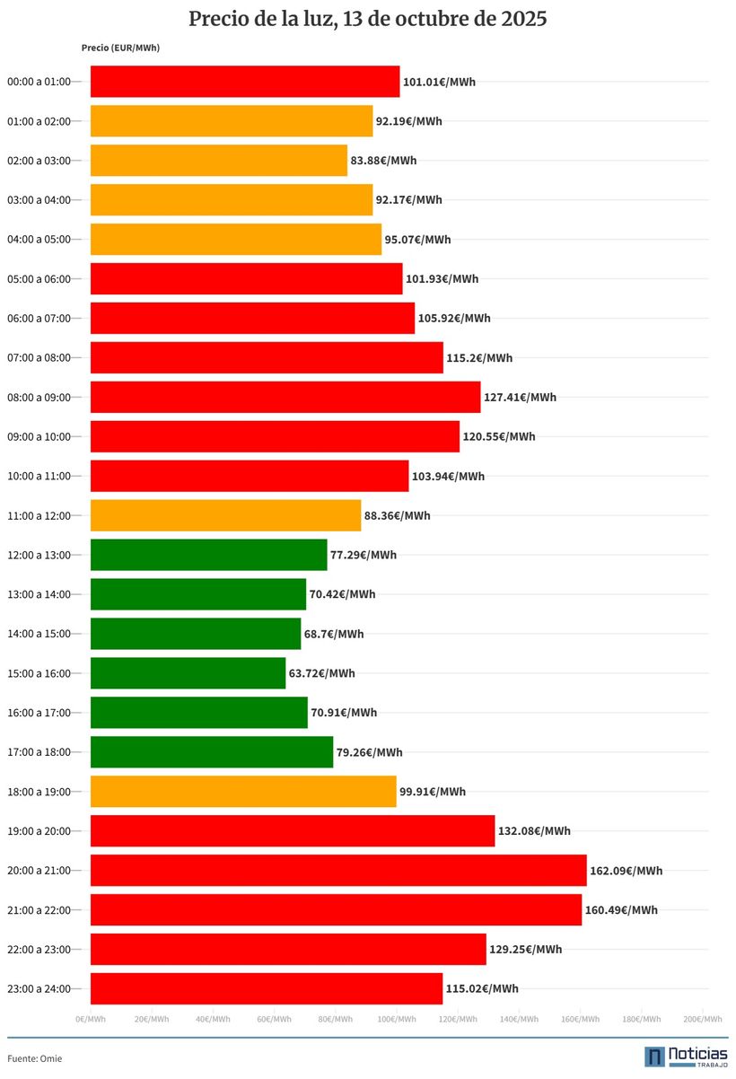 El precio de la luz por horas lunes 13 de octubre de 2025