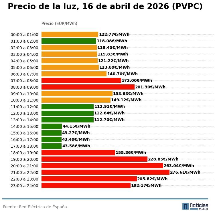 Precio de la luz por horas, jueves 16 de abril (PVPC)