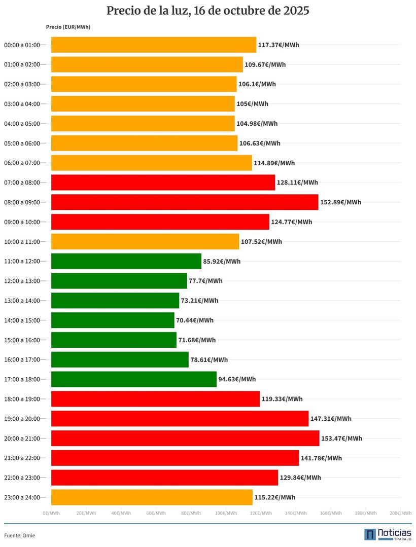 Precio de la luz por horas jueves 16 de octubre