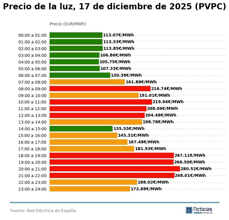Precio de la luz por horas, miércoles 17 de diciembre (PVPC)