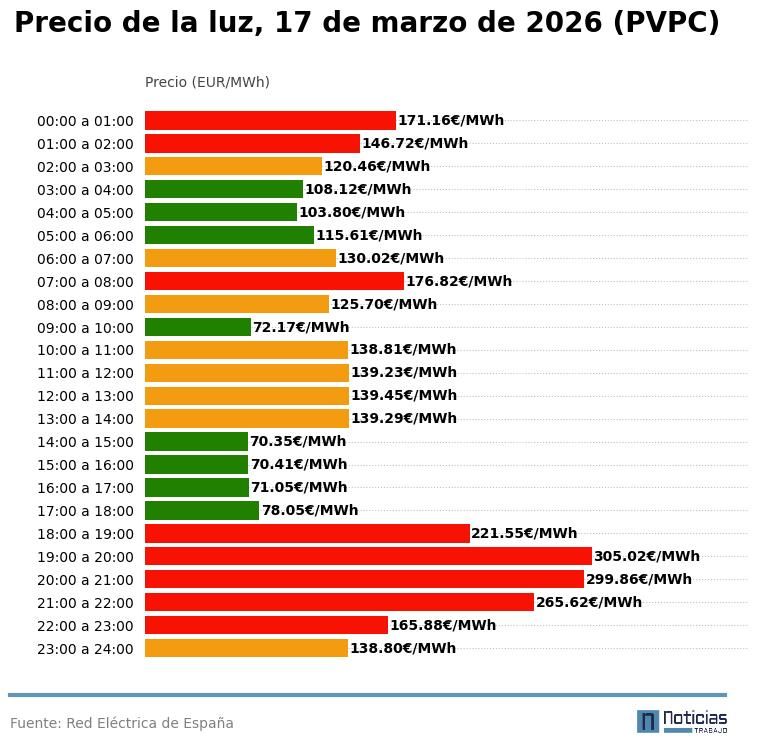 Precio de la luz por horas, martes 17 de marzo (PVPC)