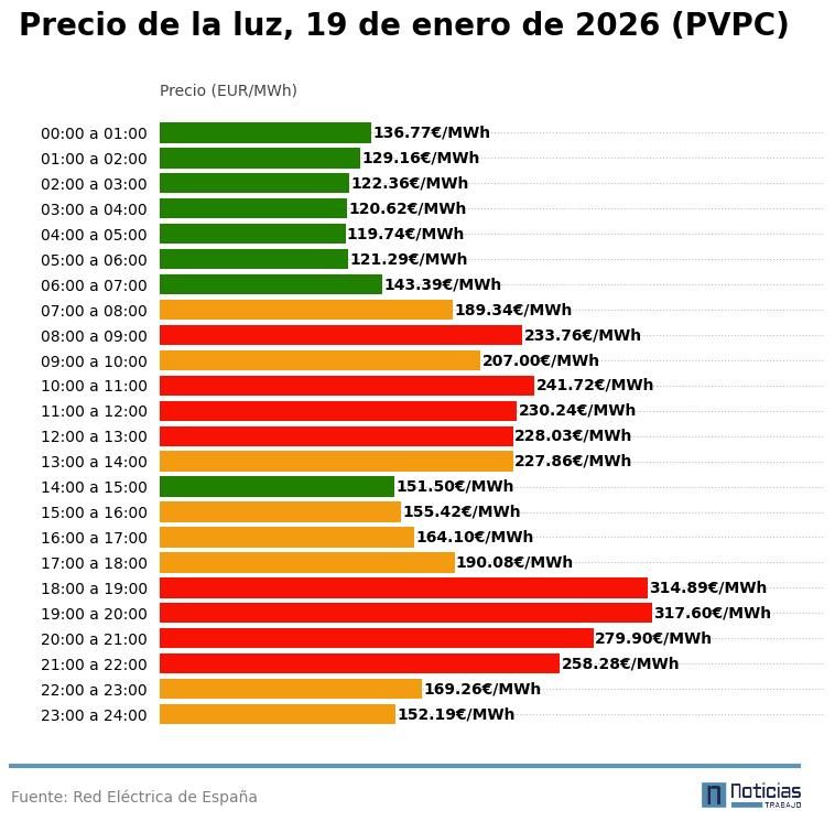 Precio de la luz por horas, lunes 19 de enero (PVPC)