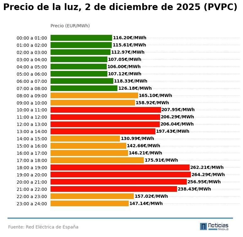 Precio de la luz por horas, martes 2 de diciembre (PVPC)