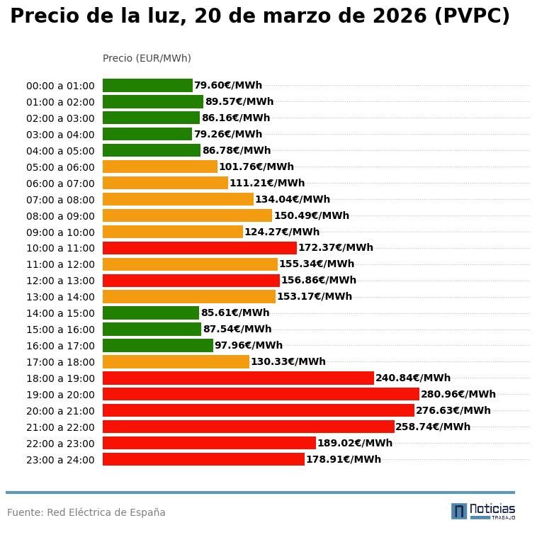 Precio de la luz por horas, viernes 20 de marzo (PVPC)