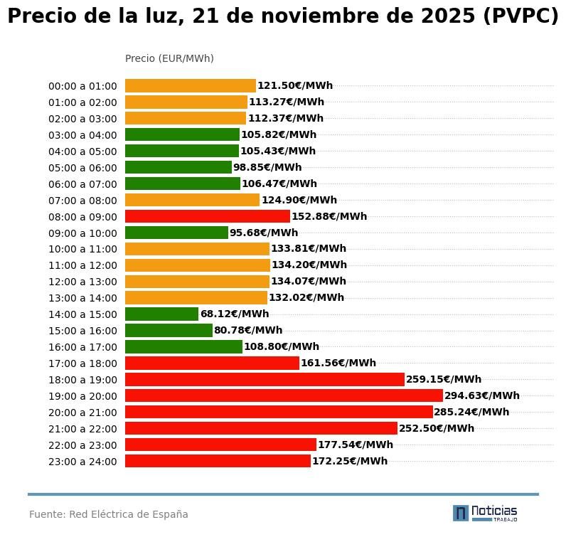 Precio de la luz por horas viernes 21 de noviembre de 2025