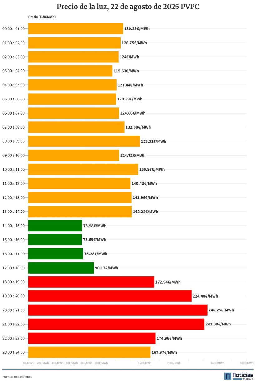 Precio de la luz por horas, viernes 22 de agosto (PVPC)