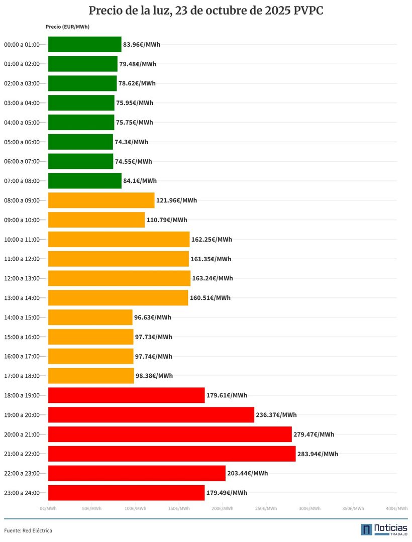 Precio de la luz por horas jueves 23 de octubre (PVPC)