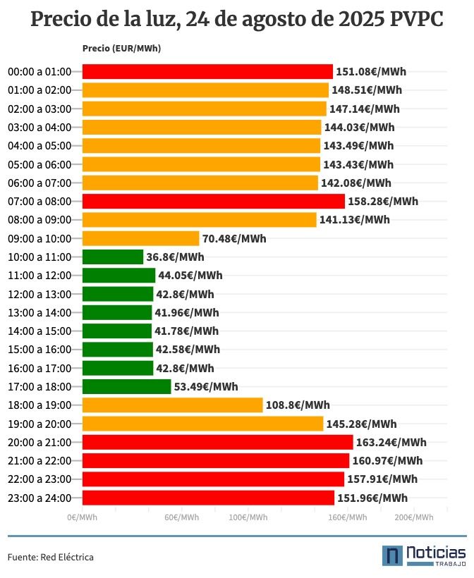 Precio de la luz por horas, domingo 24 de agosto (PVPC)