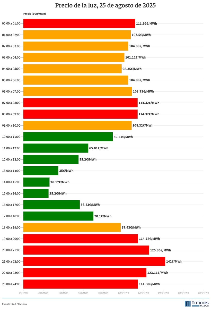 Precio de la luz por horas lunes 25 de agosto de 2025