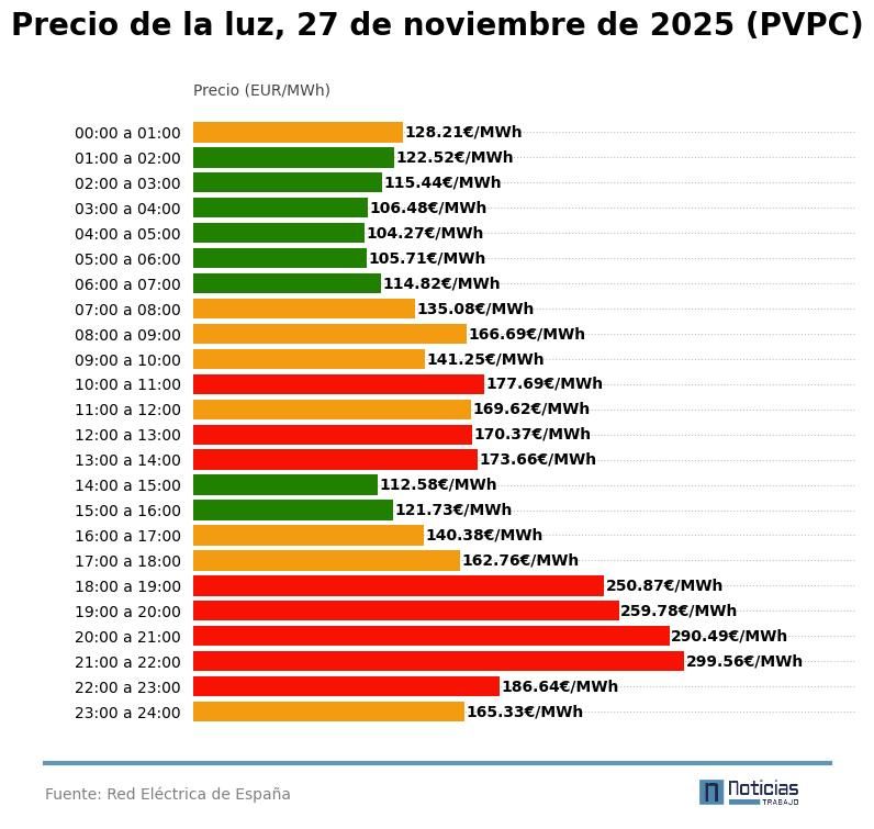 El elevado coste de la electricidad, acompañado de las diferencias significativas de precio entre unas horas y otras, hace indispensable la revisión del importe en los distintos momentos del día. En el siguiente listado se muestra el PVPC hora a hora del 27 de noviembre de 2025: