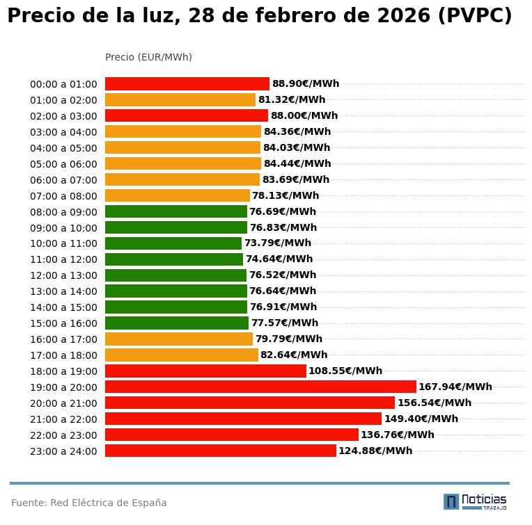 Precio de la luz por horas, sábado 28 de febrero (PVPC)