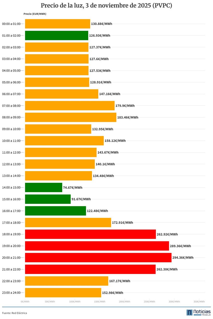 Precio de la luz por horas, lunes 3 de noviembre (PVPC)