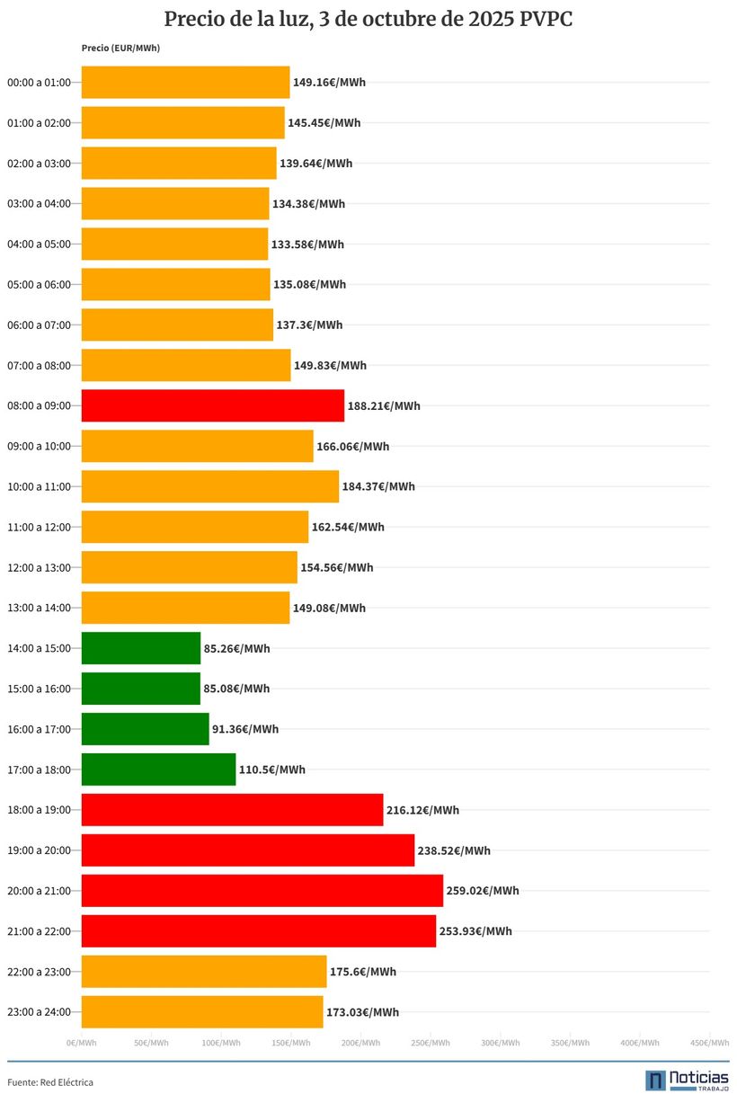 El precio medio de la electricidad para este viernes, 3 de octubre de 2025, vuelve a subir hasta los 159,06 euros/MWh para los consumidores con tarifa regulada o indexada en el mercado libre, según los datos publicados por Red Eléctrica. Esto supone que la luz se paga un 2,45% más cara que el jueves 2 de septiembre, cuando su precio fue de 155,26 euros/MWh.