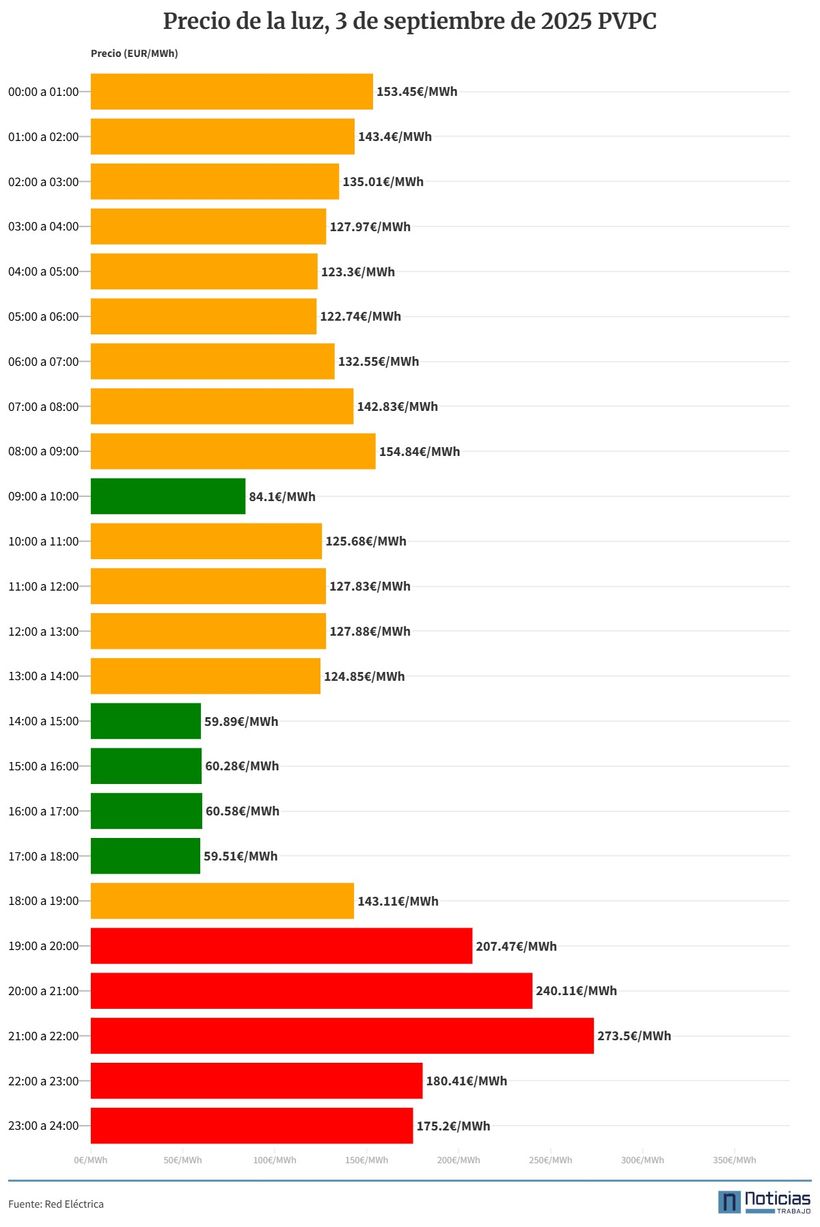 Aún con la bajada del precio de la electricidad, la diferencia de importes entre tramos es considerable, y ajustar el consumo a los momentos más baratos de la jornada puede suponer una gran diferencia en la factura. En el siguiente listado se muestra el PVPC hora a hora de la luz del miércoles 3 de septiembre:
