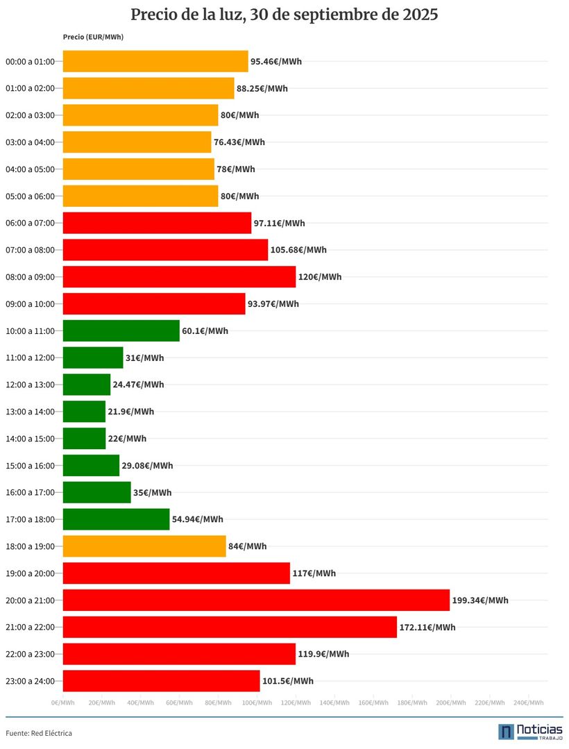 Para esta jornada de martes 30 de septiembre habrá que tener en cuenta cuál es el precio de la luz por horas para poder ajustar el consumo eléctrico a estas franjas. Además, como se comprueba, hay varios momentos del día en los que el coste es mayor a 100 euros, llegando casi a los 200 euros, por lo que habrá que consultar el precio de la luz hora a hora durante las 24 franjas del día para poder ahorrar en la factura de la luz a fin de mes.