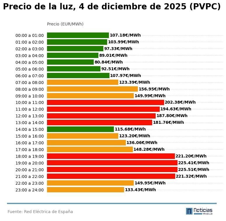 Precio de la luz por horas, jueves 4 de diciembre (PVPC)