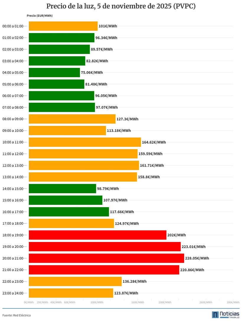 El precio medio de la electricidad para este miércoles 5 de noviembre de 2025 baja (un día más) hasta colocarse de media en los 123,87 euros/MWh para los consumidores que tienen la tarifa regulada o indexada en el mercado libre, según los datos que ha publicado Red Eléctrica. Esto quiere decir que, si se compara con el precio registrado este martes 4 de noviembre (143,58 euros/MWh), la luz es un 15,92% más económico.