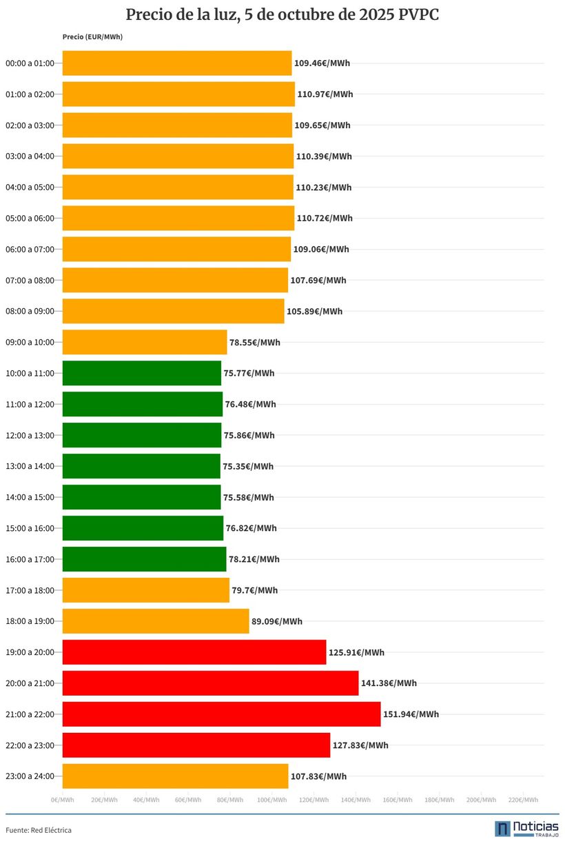 Aún con la bajada del precio de la electricidad, la diferencia de importes entre tramos es considerable, y ajustar el consumo a los momentos más baratos de la jornada puede suponer una gran diferencia en la factura. En el siguiente listado se muestra el PVPC hora a hora de la luz del domingo 5 de octubre: