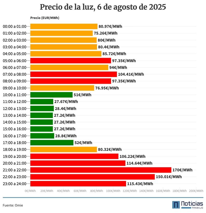 Como viene siendo habitual, los tramos horarios más baratos se situarán entre 10:00 y las 18:00 horas, donde el precio medio no superará los 30 euros. Ahora, conviene evitar las últimas horas de la jornada, donde el precio se dispara hasta los 170 euros, tal y como se muestra en el siguiente listado: