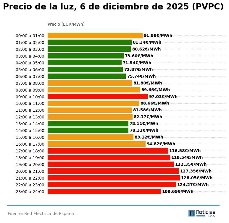 Precio de la luz por horas, sábado 6 de diciembre (PVPC)