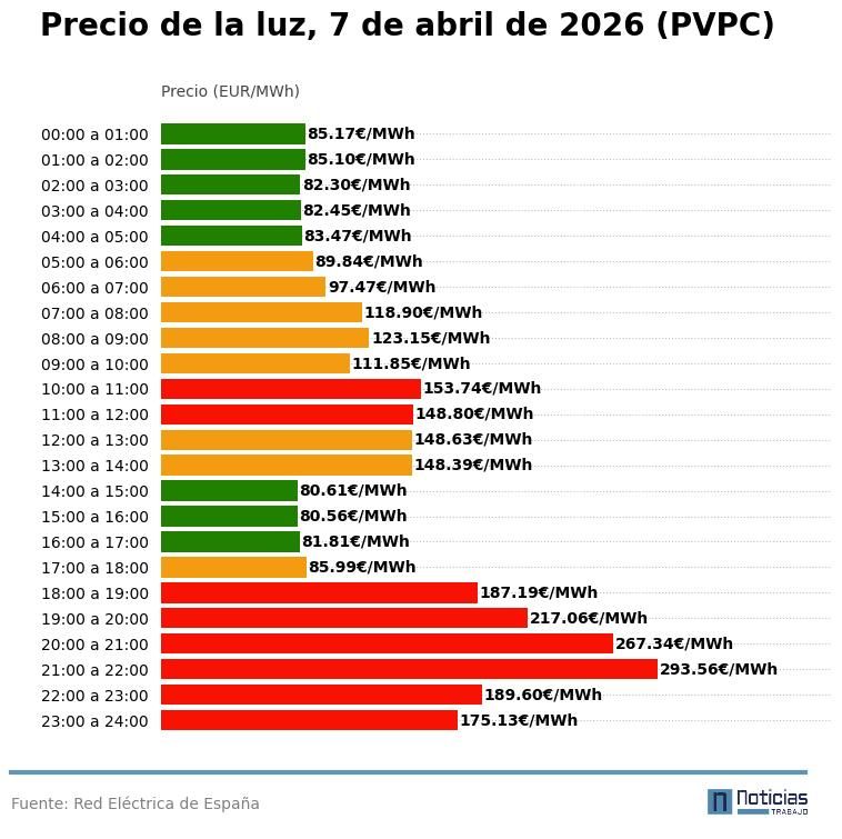 Precio de la luz por horas, martes 7 de abril (PVPC)