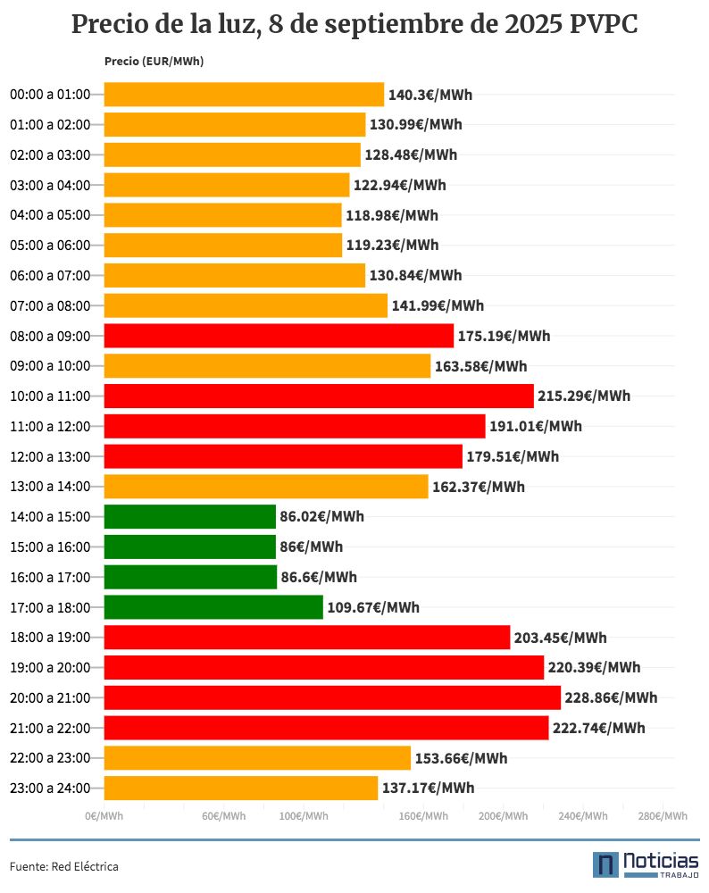 ¿A qué hora es más cara la luz hoy, lunes 8 de septiembre?