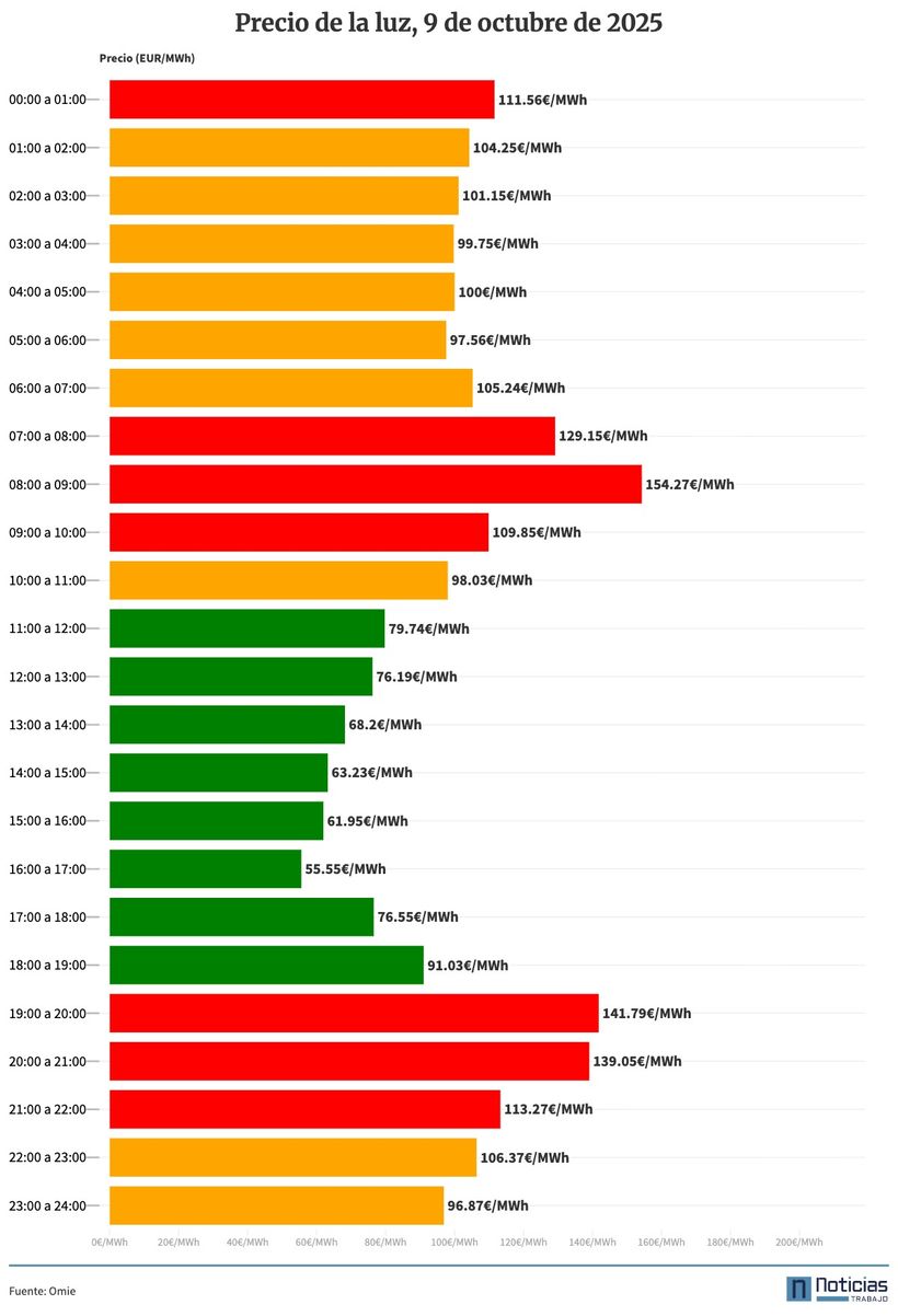 Pese a la bajada, la electricidad sigue manteniéndose en valores altos, por lo que para ahorrar en la factura conviene revisar el precio de la luz hora a hora de 9 de octubre de 2025 que se muestra en el siguiente listado