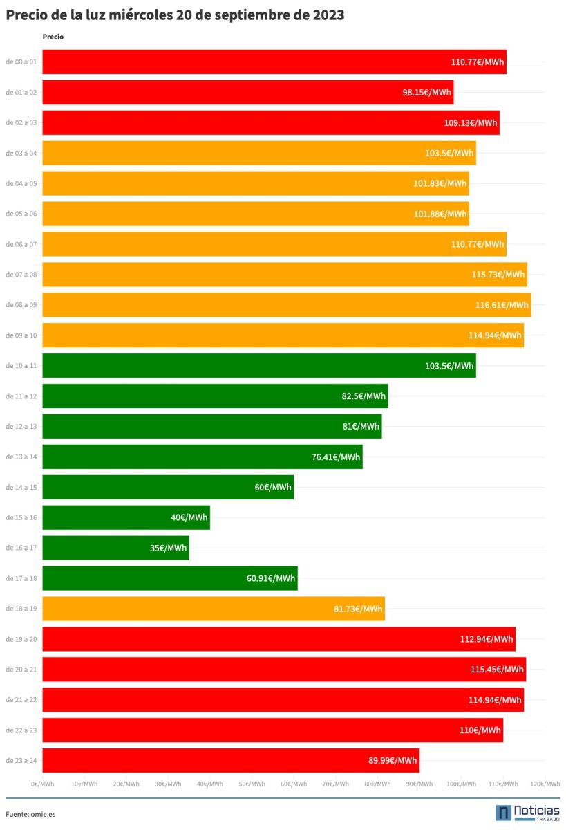 Precio de la luz por horas, miércoles 20 de septiembre de 2023