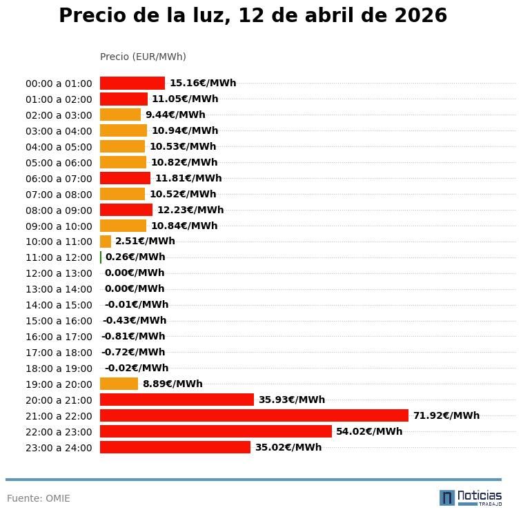 El precio medio de la luz para este domingo 12 de abril de 2026 se desploma y se sitúa en 13,33 euros el megavatio hora (euros/MWh). Si se compara con la tarifa marcada el sábado 11 de abril, la electricidad se abarata un 53,89%, es decir, se paga a 15,58 euros menos, ya que ese día el precio fue de 28,91 euros/MWh según los datos publicados por el Operador del Mercado Ibérico de la Energía (OMIE).