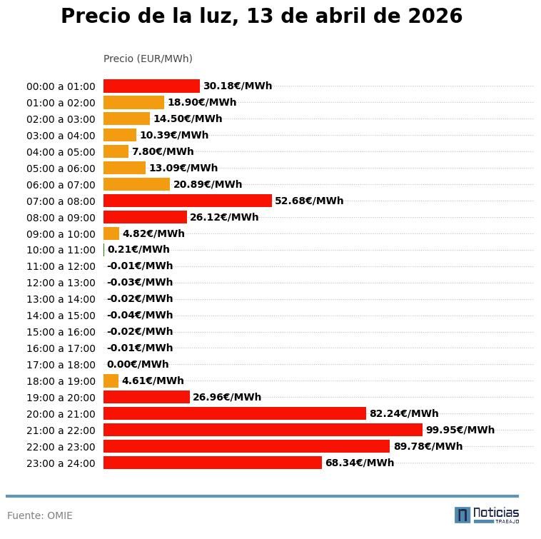 El precio medio de la luz para este lunes 13 de abril de 2026 sube esta vez llegando hasta los 23,81 euros el megavatio hora (euros/MWh). En comparación con la tarifa marcada el domingo 12 de abril, la electricidad aumenta su coste un 78.59%, es decir, se paga a 10,48 euros más, ya que ese día el precio fue de 13,33 euros/MWh según los datos publicados por el Operador del Mercado Ibérico de la Energía (OMIE).