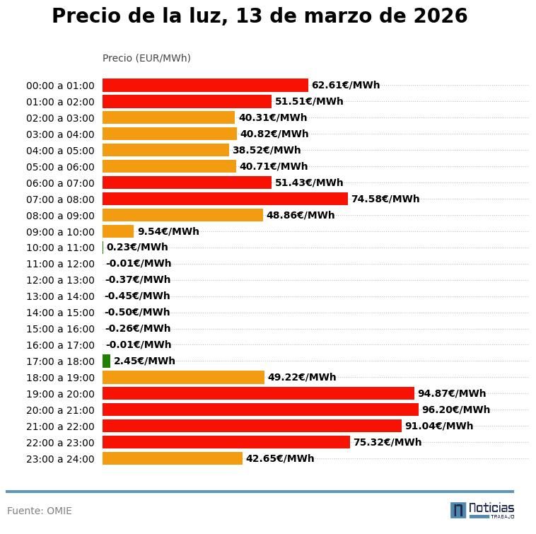 El precio medio de la luz para este viernes 13 de marzo de 2026 vuelve a caer y llega a los 37,89 euros el megavatio hora (euros/MWh). En comparación con la tarifa marcada el jueves 12 de marzo, la electricidad se abarata un 46,79%, es decir, se paga a 33,31 euros menos, ya que ese día el precio fue de 71,20 euros/MWh según los datos publicados por el Operador del Mercado Ibérico de la Energía (OMIE).