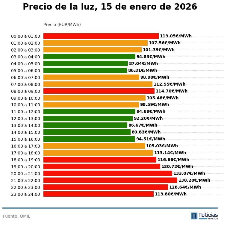 Este jueves, 15 de enero de 2026, el precio de la electricidad se mueve en niveles altos durante buena parte del día. En total, 14 tramos superan los 100 euros/MWh, con especial intensidad en la tarde-noche.