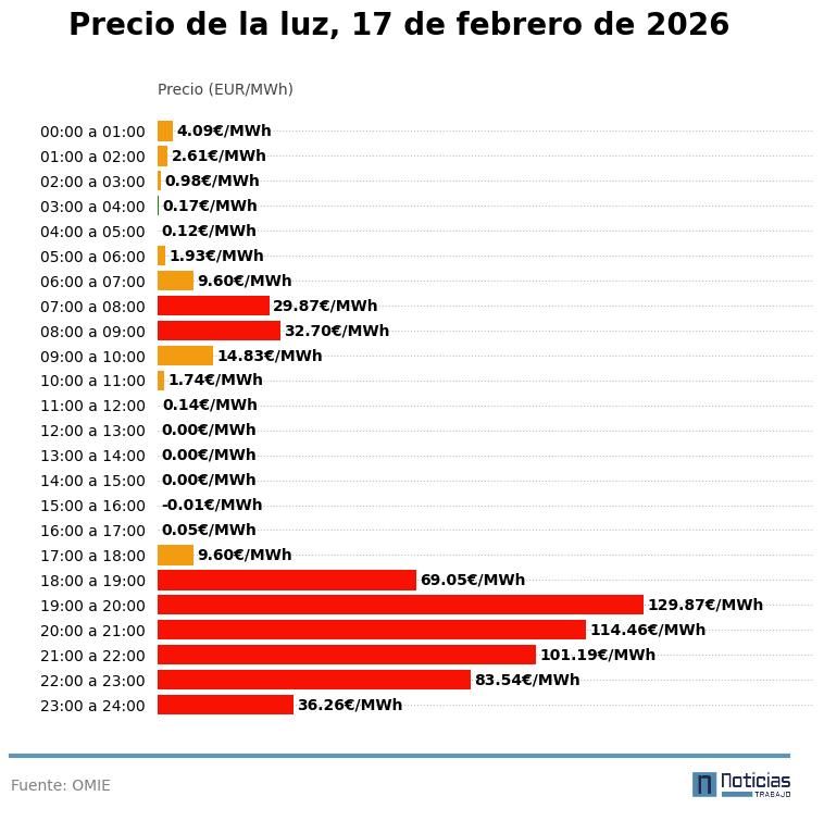 Precio de la luz por horas, martes 17 de febrero