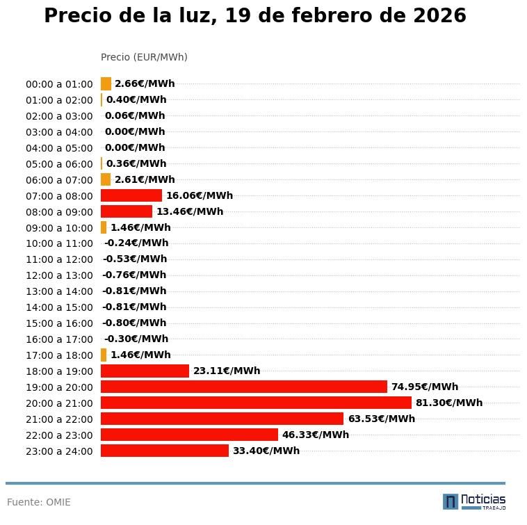 El precio medio de la luz para este jueves 19 de febrero de 2026 baja levemente hasta los 14,87 euros el megavatio hora (euros/MWh). En comparación con la tarifa marcada el miércoles 18 de febrero, la electricidad decrece un 18,47%, es decir, se paga a 3,37 euros más, ya que ese día el precio fue de 18,24 euros/MWh según los datos publicados por el Operador del Mercado Ibérico de la Energía (OMIE).
