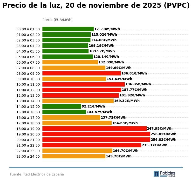 Precio de la luz por horas jueves 20 de noviembre de 2025