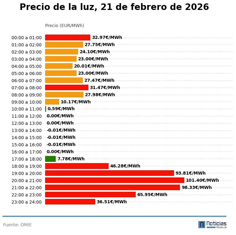 El precio medio de la luz para este sábado 21 de febrero de 2026 sube levemente hasta los 29,11 euros el megavatio hora (euros/MWh). En comparación con la tarifa marcada el viernes 20 de febrero, la electricidad sube solo un 2,56%, es decir, se paga a 0,73 euros más, ya que ese día el precio fue de 28,38 euros/MWh según los datos publicados por el Operador del Mercado Ibérico de la Energía (OMIE).