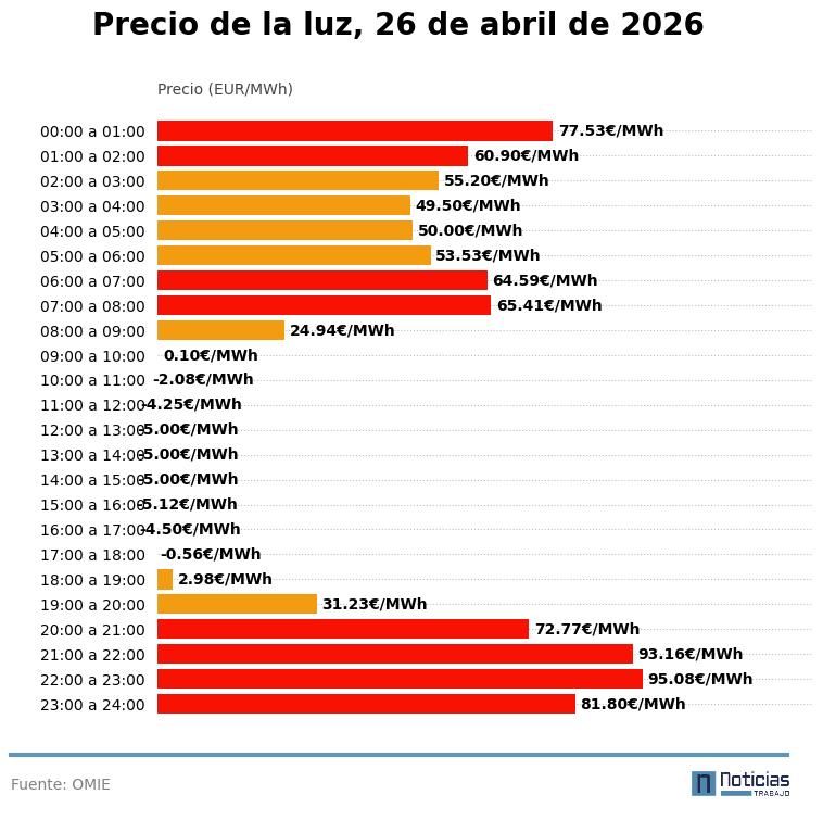 Ahora, al comparar el día de hoy con el mismo de hace un año, se aprecia una subida del 537,2% ya que el 26 de abril de 2025 el precio medio era de 5,54 euros por megavatio hora mientras que este año es de 35,30 euros.