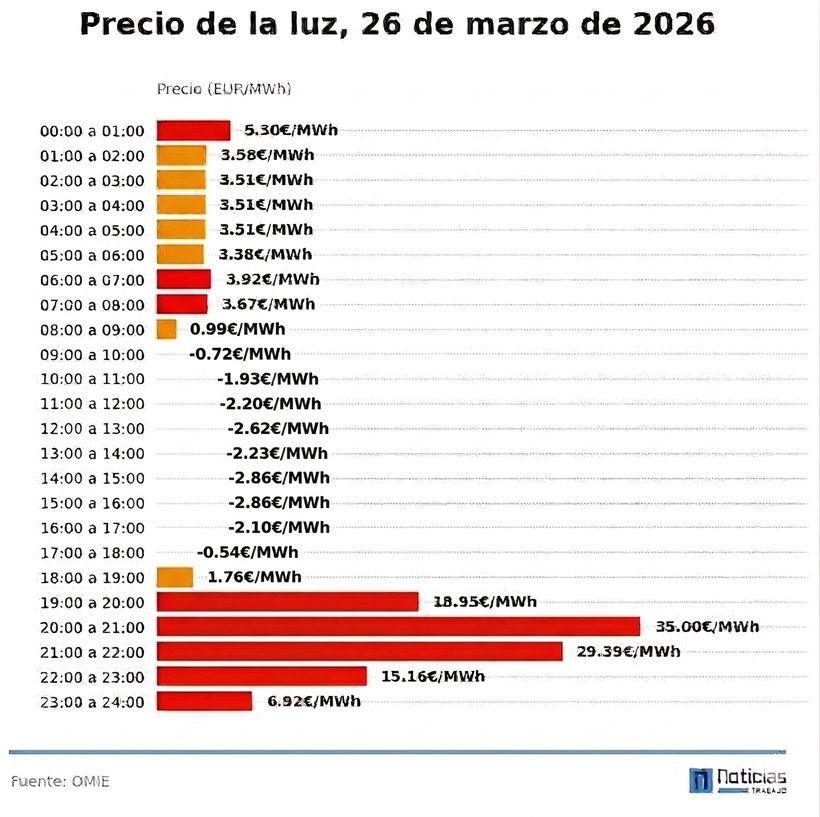 El precio medio de la luz para este jueves 26 de marzo de 2026 se desploma hasta los 5,02 euros el megavatio hora (euros/MWh). En comparación con la tarifa marcada el miércoles 25 de marzo, la electricidad se abarata un 73,65%, es decir, se paga a 14,03 euros menos, ya que ese día el precio fue de 19,05 euros/MWh según los datos publicados por el Operador del Mercado Ibérico de la Energía (OMIE).