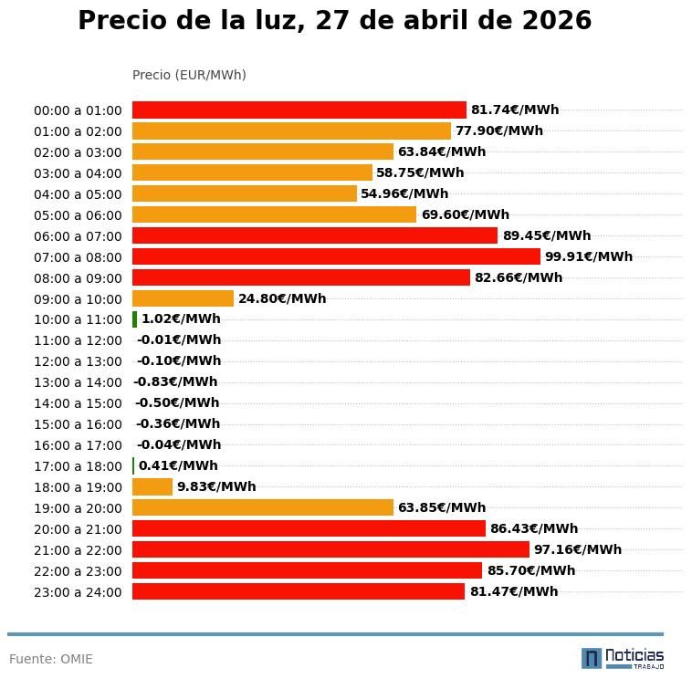El precio medio de la luz para este lunes 27 de abril de 2026 es de 46,99 euros el megavatio hora (euros/MWh) según los datos oficiales que ha publicado el Operador del Mercado Ibérico de la Energía (OMIE). La electricidad, este lunes experimenta una fuerte subida del 41,6% si se tiene en cuenta el precio medio de la luz (pool) de este domingo que era de 35,30 euros/MWh. Esto al bolsillo significa pagar 14,69 euros más.